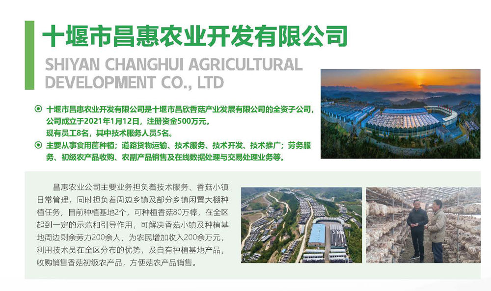 十堰市昌惠农业开发有限公司是十堰市昌欣香菇产业发展有限公司全资子公司,公司成立于2021年1月12日,注册资金500万元,现有员工8名员工,其中技术服务人员5名,主要从事食用菌种植;道路货物运输、技术服务、技术开发、技术推广;劳务服务、初级农产品收购、农副产品销售及在线数据处理与交易处理业务等。公司围绕区委、区政府在全区大力发展香菇产业,壮大集体经济,把香菇产业作为乡村振兴的主导产业,农民致富支柱产业这一主线开展工作。对全区现有乡镇制棒厂设备设施进行管护、维护;承担香菇小镇1200余亩香菇产业园全方位管理责任;对全区范围内香菇基地闲置空棚有选择性的种植经营,在全区起到一定的示范和引导作用,公司利用技术员在全区分布的优势,收购销售香菇初级农产品,解决菇农种植中遇到的所有难题的同时,利用好的资源和平台来提高郧阳香菇知名度,让全国更多的人了解到它的出处及它自身营养价值。